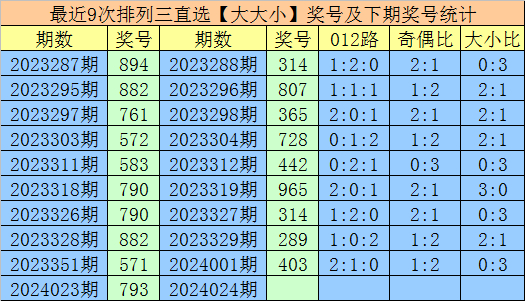上期回顾:排列三第2024023期奖号为793,组六,大小比开出2:1,直选分布为:大大小。