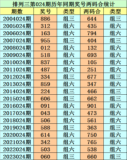 排列三从2004年开奖至今已开出6795期奖号了,其中第024期历史同期奖号出现20次,历年第024期分别开出号码:886、312、163、955、012、518、837、487、334、859、224、606、091、043、506、588、614、342、503、060。