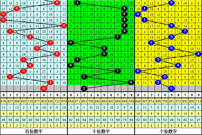 在历年同期中两码合开出年限分别为:6出现9年,3、4、5出现7年,7出现6年,0、1出现5年,2、9出现3年,8出现1年,第2024024期预计两码合出现:1、7、8。