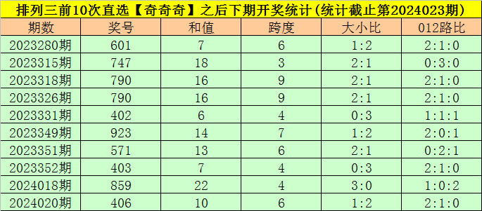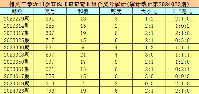 开奖回顾:排列三第2024023期开出奖号:793,类型为组六,和值为19,奇偶比为3:0,大小比为2:1,跨度为6。