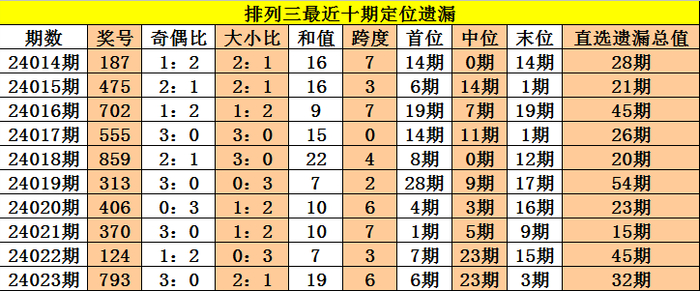 开奖回顾:排列三第2024023期奖号:793,定位直选遗漏值6期、23期、3期,遗漏总值为32期。