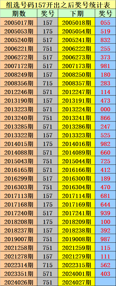 排列三组选157出现之后下期分别开出:055、519、832、255、373、981、180、283、114、473、000、866、247、525、982、660、725、412、189、470、681、644、939、100、392、987、115、111、562、403。
