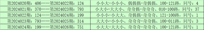 统计排列三已开出的奖号发现,在连续5期(第2024020期-第2024024)奖号为:406-370-124-793-199。