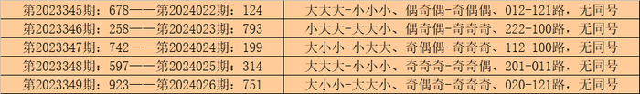 在排列三历史开奖中,第2023345期-第2023349期连续5期奖号为:678-258-742-597-923。