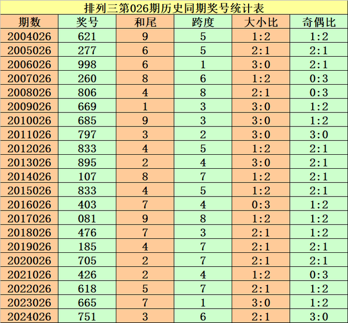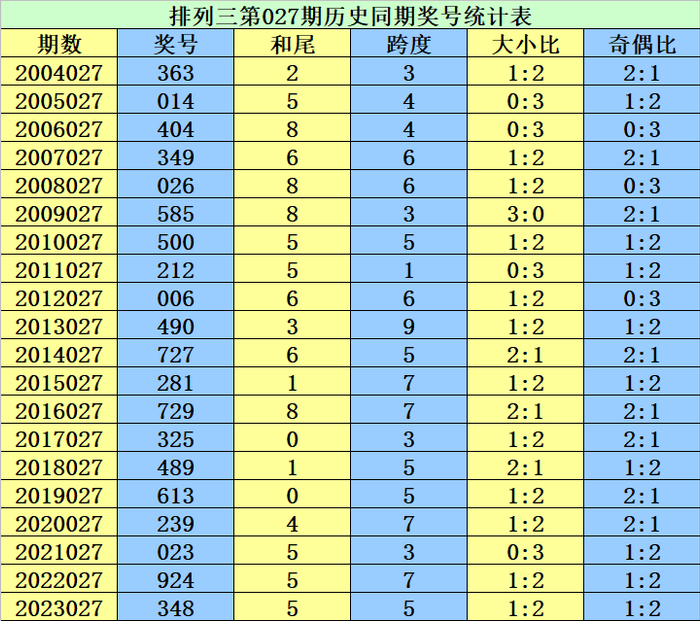 从2004年至今排列三已开出6798期奖号了,本期为排列三2024年第027期开奖,历史同期已出现20次奖号: