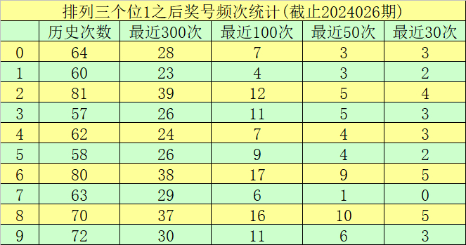 第三位杀号:第三位上期出现奖号1,该位历史上奖号1已开出了668次,最近100次第三位开出1时,下期号码0-9分别落号:号码6→17次,8→16次,2→12次,3、9→11次,5→9次,0、4→7次,7→6次,1→4次。