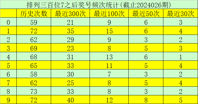 第一位杀号:上期第一位奖号为7,第一位奖号7历史上出现661次,前100次该位开出奖号7之后,下期号码0-9出现次数从高到底分别为:号码1→15次,4→13次,9→12次,5→11次,0、2→9次,3、7、8→8次,6→7次。