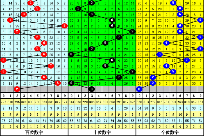 三、十位分析:上期开出号码0,前10次号码0出现之后下期同位号码为:1746616986,其中号码大小比为7:3,小 号走势较冷;奇偶比为4:6,基本相等;012路比为5:4:1,0路号码表现相对活跃。本期参考号码:3。