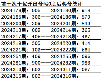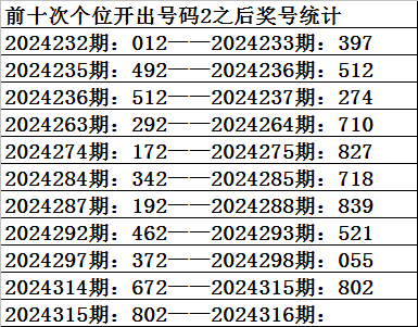 四、个位分析:上期开出号码2,前10次号码2出现之后下期同位号码为:7240789152,其中号码大小比为5:5,相等;奇偶比为5:5,相等;012路比为2:4:4,0路号码表现相对较冷。本期参考号码:0。