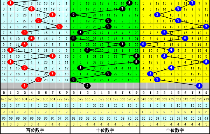 另外组选分布中,号码大小比为5:10,大号走势较冷;号码奇偶比为8:7,奇偶号码出现比例相当;号码012路为7:5:3,0路号码表现活跃。且每期奖号都与最近5期奖号有相同的号码。(统计见下表)