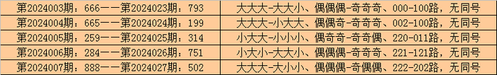在排列三历史开奖中,第2024003期-第2024007期连续5期奖号为:666-665-259-284-888。
