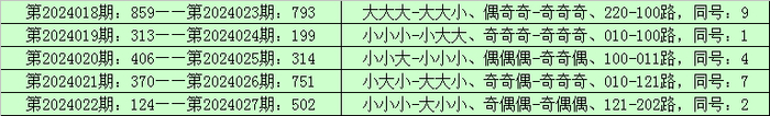 统计排列三已开出的奖号发现,在连续5期(第2024018期-第2024022)奖号为:859-313-406-370-124。