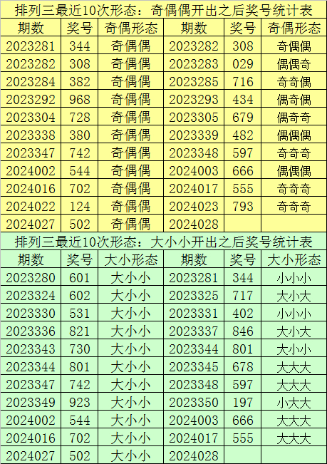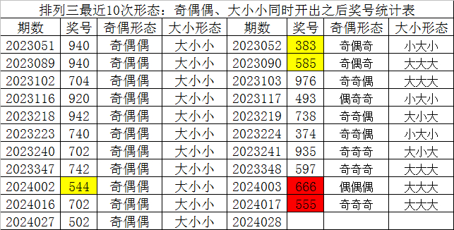 排列三最近10次同时开出奇偶形态:奇偶偶和大小形态:大小小时其奖号分别为:940-940-704-920-942-740-702-742-544-702-502,下期分别开出号码为:383-585-976-493-738-374-935-597-666-555,详细统计见下表:
