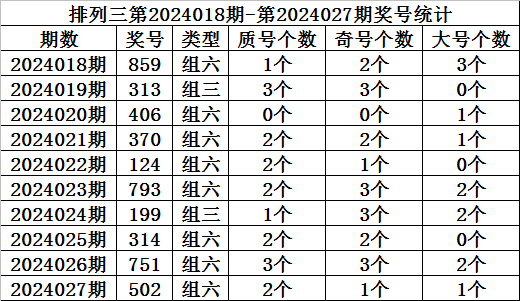 上期回顾:排列三第2024027期开奖:502,质合比为2:1,奇偶比为1:2,大小比为1:2。