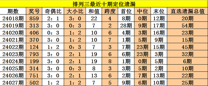 开奖回顾:排列三第2024027期奖号:502,定位直选遗漏值9期、6期、10期,遗漏总值为25期。