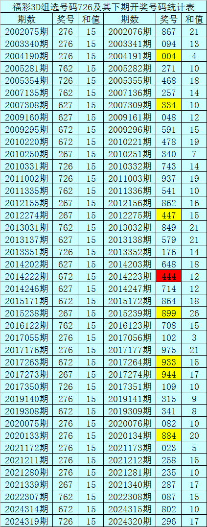 二、组选分析:历史上组选号码726开出了41次,其下期奖号分别为:867-094-004-271-468-257-334-048-591-478-340-743-937-541-862-447-849-579-176-648-444-714-864-899-708-102-975-933-944-109-315-341-082-884-023-258-235-287-087-802,其开出期数和下期奖号统计为: