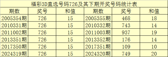 一、开奖回顾:第2024319期福彩3D奖号为726。奖号奇偶比为1:2,和值为:15,跨度为:5。