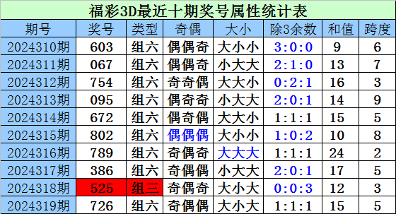 上期回顾:上期开奖奖号为726,类型:组六,奇偶偶,大小大,1:1:1,和值15,跨度5。