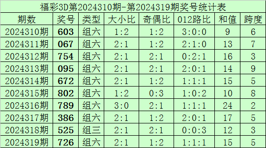开奖回顾:福彩3D第2024319期奖号为726,其中奖号大小比为2:1,奇偶比为1:2,012路比为1:1:1,和值为15,跨度为5。