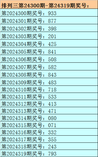 开奖回顾:排列三第2024319期开出奖号:793。其中奖号大小比为2:1,奇偶比为3:0,012路比为2:1:0,和值为19,跨度为6。