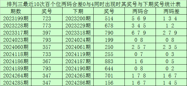 百个位合差分析:上期奖号百个位开出73组合,两码合为0,两码差为4,最近10次百个位两码合0与两码差4同时出现时,其奖号和下期奖号分别为: