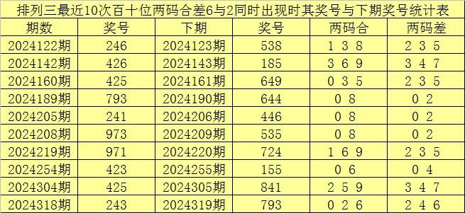 百十位合差分析:上期奖号百十位开出79组合,两码合为6,两码差为2,最近10次百十位两码合6与两码差2同时出现时,其奖号和下期奖号分别为: