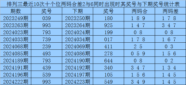 十个位合差分析:上期奖号十个位开出93组合,两码合为2,两码差为6,最近10次十个位两码合2与两码差6同时出现时,其奖号和下期奖号分别为: