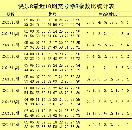 福彩快乐8第2024319期开奖回顾:02 05 08 09 11 18 22 26 27 28 33 44 53 55 56 58 61 72 77 80,其中奖号除8余数比为4:2:4:2:2:4:1:1。