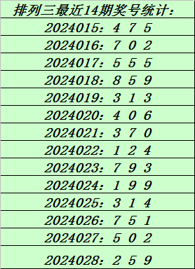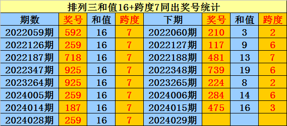 上期回顾:排列三第2024028期奖号:259。和值16,跨度7。