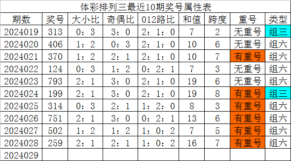 体彩排列三最近10期分别开出奖号:313、406、370、124、793、199、314、751、502、259,各奖号属性详见下表: