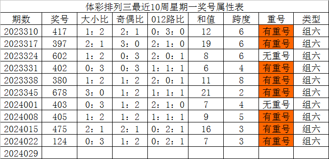体彩排列三最近10周星期一奖号分别为:417、397、602、402、380、678、403、405、475、124,各奖号属性详见下表:
