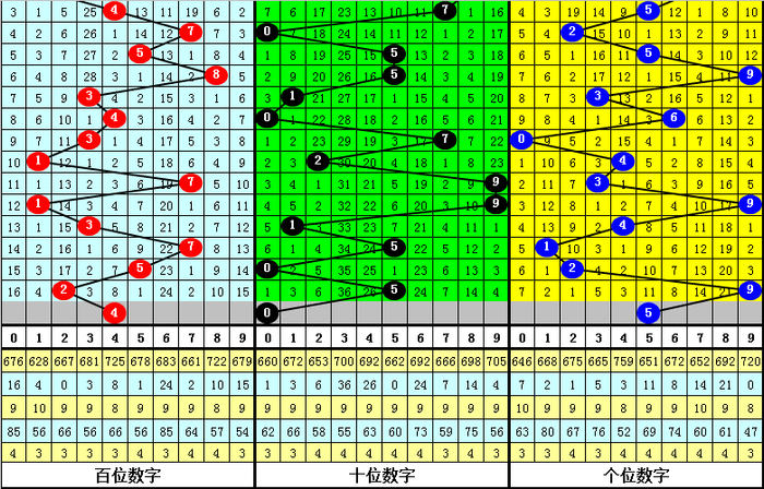 其中,号码0-9开出次数分别为:号码0开出4次、1开出3次、2开出1次、3开出5次、4开出2次、5开出7次、6开出0次、7开出3次、8开出3次、9开出2次。