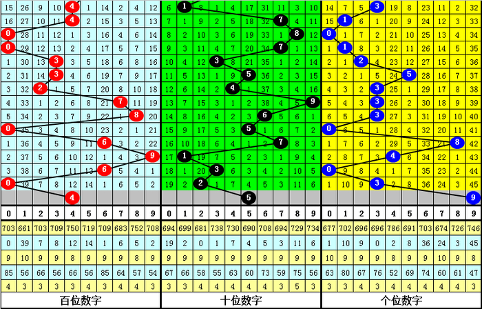 上期第一位开出奖号:0,间隔3期出现,表现较热,最近10期该位温码走势较冷,短期内防止该位温冷回补,本期注意温码,参考号码4。