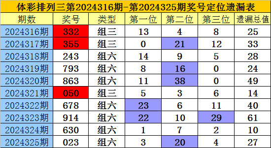 开奖回顾:排列三第2024325期奖号为:023,各位号码遗漏值分别为3、20、4,遗漏总值为27。