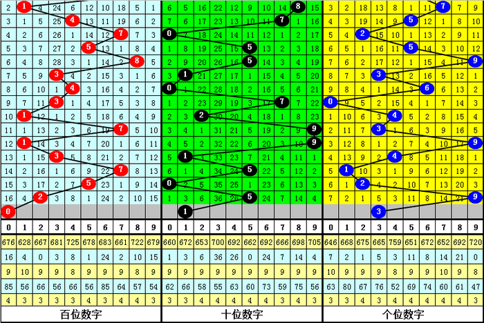 个位:上期奖号为9,近10期012路比为6:3:1,其中0路号遗漏3期再出,本期个位防0路号,关注3。