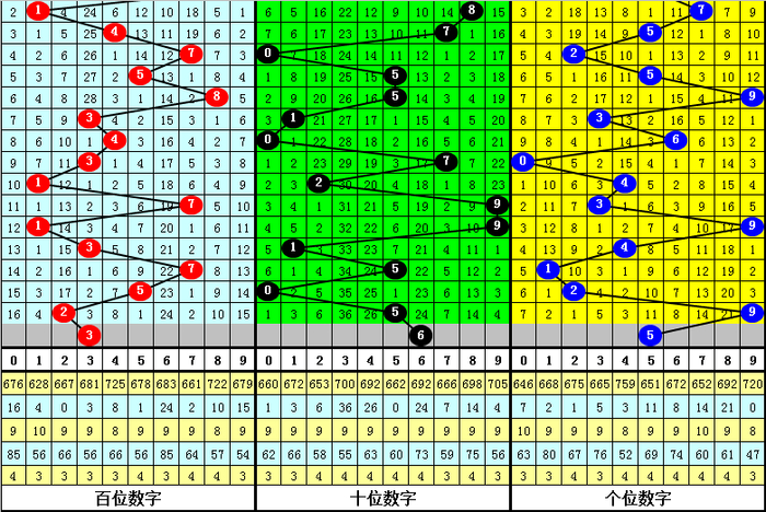 百位走势:近10期在1-7之间出号,跨度为7点,出号比较分散,上期奖号为2,下降3点,本期看好该位上升。另外近10期该位大小比为3:7,小号大热,本期小号再出,关注号码3。