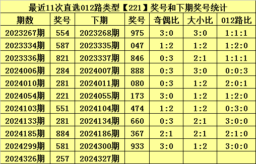 排列三上期开出奖号为:257,其直选012路类型为221,历史上直选221号码已开出了213次,最近11期分别开出奖号为:554、587、821、284、281、221、551、281、884、581、257。