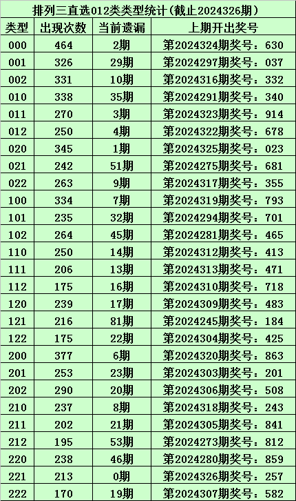 上期回顾:体彩排列三第2024326期开出奖号:257,其012路比为0:1:2,奖号012路类型为:221。