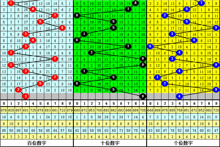 号码频次分析:最近10周星期一各号码组选出现频次分别为:号码4出现6次,号码0出现5次,号码7出现4次,号码2、3出现3次,号码1、5、6、8出现2次,号码9出现1次,本期注意最热四码:0247中包含胆码,预计奖号不会全部分布在最冷四码:5689中。