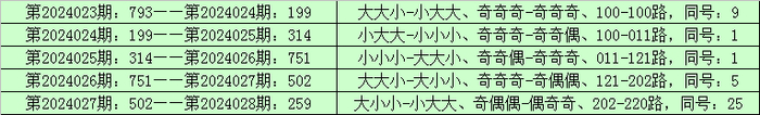 则,排列三第2024028期奖号:259,与排列三第2024029期奖号可能有相同的号码。且排列三第2024029期奖号大小比、奇偶比和012路比可以参考第2024028期奖号形态:小大大、偶奇奇和220路。