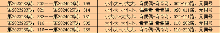 在排列三历史开奖中,第2023282期-第2023286期连续5期奖号为:308-029-382-716-116。