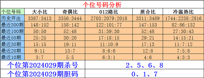 近期个位质数号码走冷,目前轮空1期,本期防质数号码回补;近期该位小号明显活跃,上期走冷之后,本期预计再出小号。个位杀号:2568,胆码关注:017。