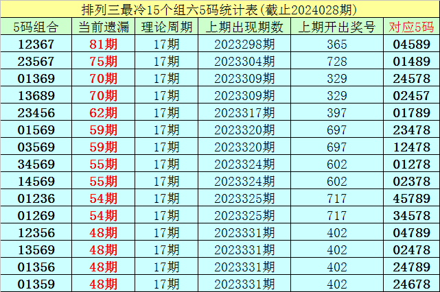 (4)排列三第2024028期遗漏值最大的十个5码组六组合解冻了0个;