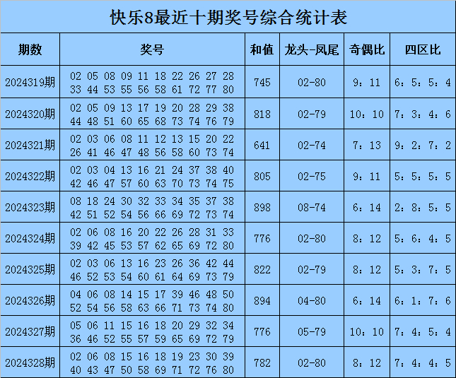 福彩快乐8第2024328期开奖回顾:02 06 08 15 16 18 19 23 30 39 40 43 47 50 58 69 71 72 76 80,其中奖号和值为782,跨度为78,奇偶比开出8:12,012路比开出7:6:7,四区比开出7:4:4:5。