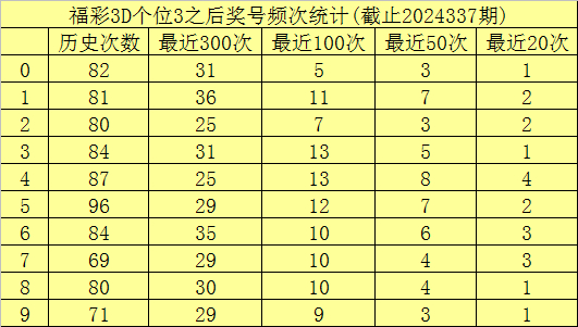 个位杀号:上期个位奖号为3,历史上个位奖号3共开出815次,最近100次个位奖号3出现时,其下期号码0-9开出次数分别为:奖号4、3开出13次,5开出12次,1开出11次,6、7、8开出10次,9开出9次,2开出7次,0开出5次。