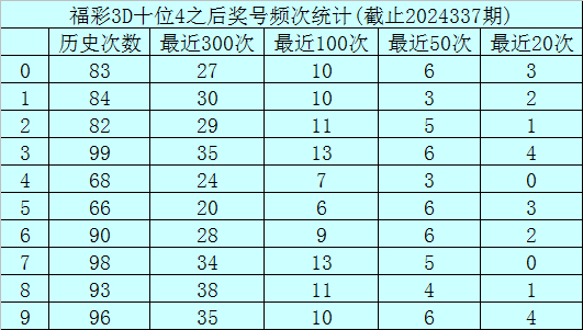 十位杀号:上期十位奖号为4,历史上十位奖号4共出现860期,前100次十位开出奖号4时,其下期0-9奖号频次分别为:奖号3、7开出13次,2、8开出11次,0、1、9开出10次,6开出9次,4开出7次,5开出6次。