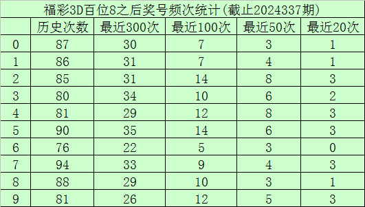 百位杀号:上期百位开出号码8,历史上百位号码8已开出849次了,最近100次百位号码8出现之后,其下期各号码频次分别为:号码5、2出现14次,4、9出现12次,3、8出现10次,7出现9次,0、1出现7次,6出现5次。