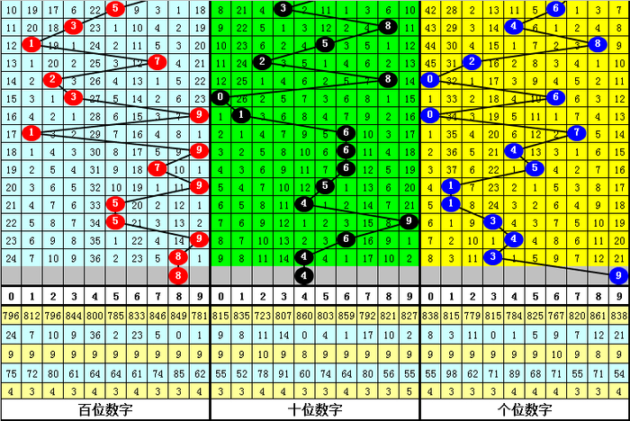 前三次百位号码8出现之后,其下期奖号分别开出:3、7、5,出现在:高频区域、低频区域、高频区域,本期百位排除高频区域号码,绝杀5码:23459。