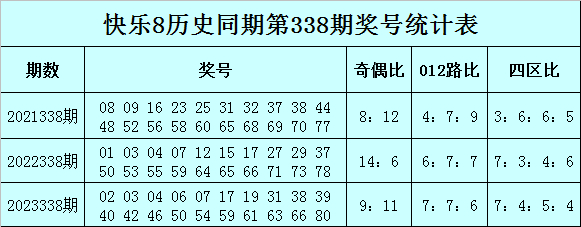 四区比分析:第338期历史同期奖号四区总比为17:13:15:15,第二区表现较冷,第一区表现热出,去年同期奖号四区比开出7:4:5:4,第二、四区走冷,第一区较热,今年第338期预计第四区表现较冷,注意第一区走势较热,四区比关注7:5:5:3。