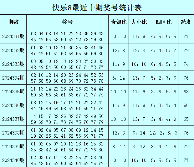 福彩快乐8第2024340期开奖回顾:02 03 07 11 18 22 25 27 38 40 46 48 57 59 60 63 64 69 76 79,其中奖号奇偶比开出10:10,大小比开出10:10,四区比开出5:5:5:5,跨度开出77。